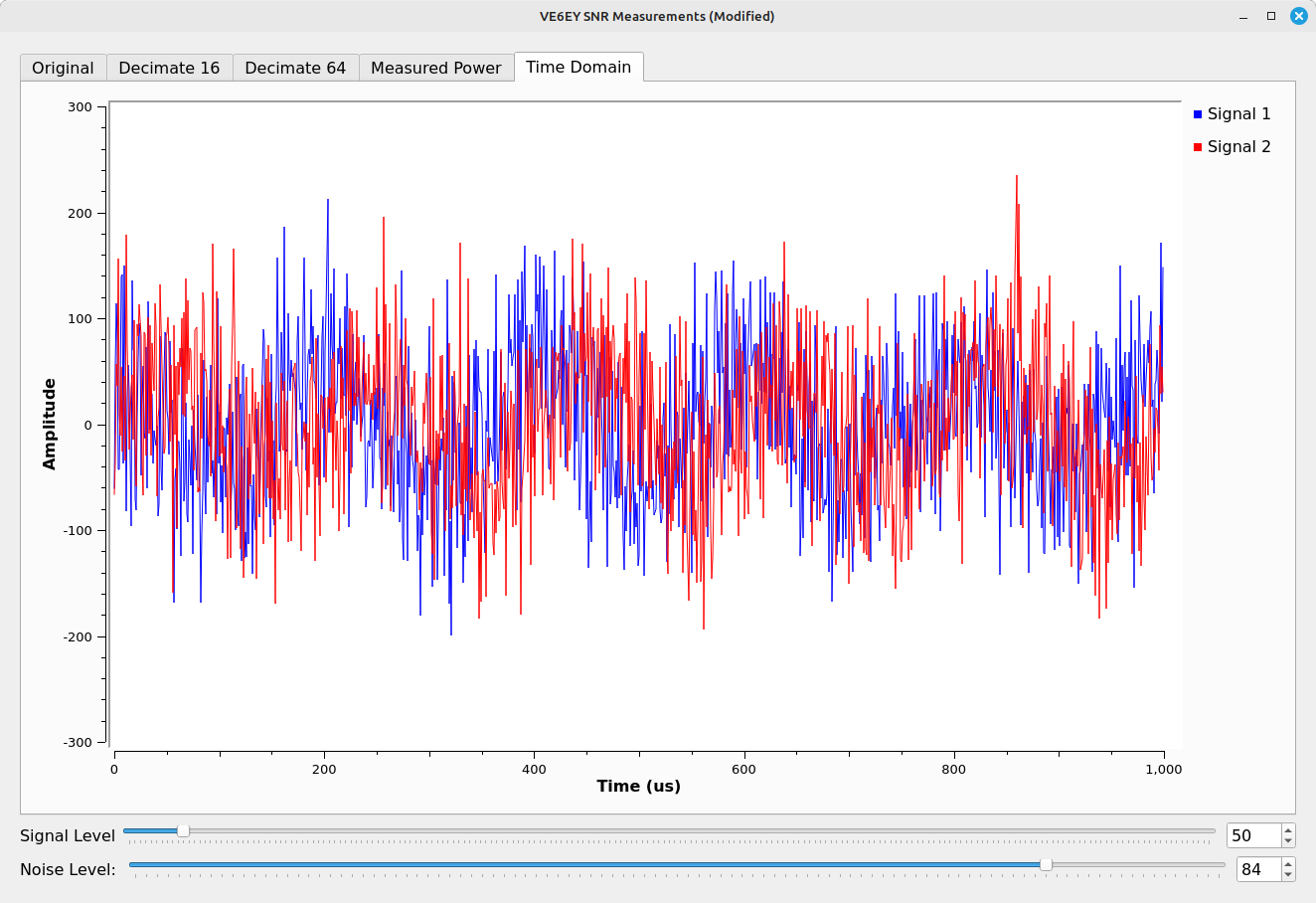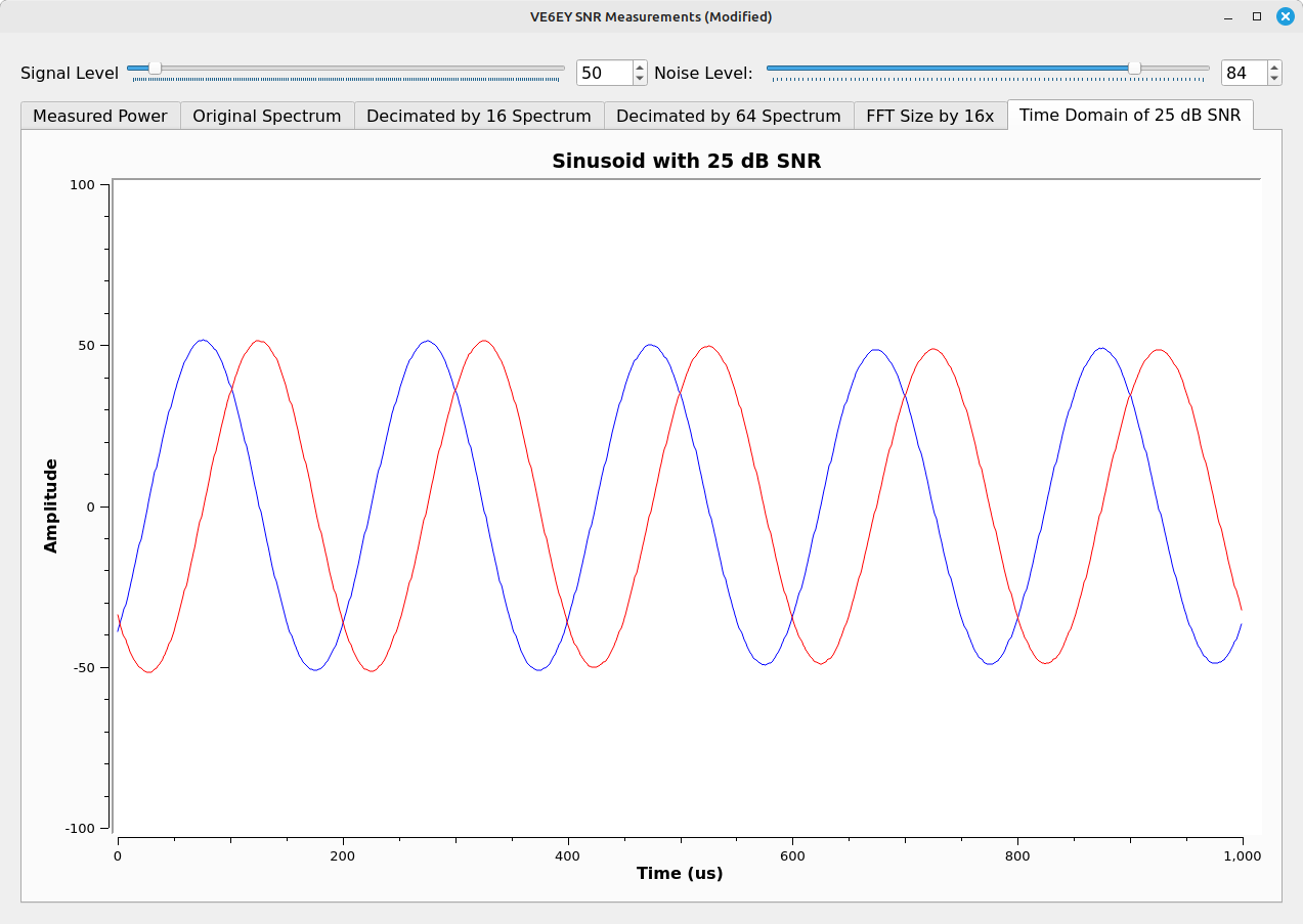Except, no, it's not. We can actually calculate the SNR based on the two values he's put into the signal source (amplitude = 50) and noise source (amplitude = 84). Since the signal source is complex, the power is this value squared, or signal power = 2500. Likewise, the noise source amplitude sets its standard deviation (equivalent to saying "volts", and also called the RMS value). It's power, too, is the squared value, or noise power = 842 = 7056. This means that the calculated SNR is actually (2500)/(7056) = 0.3543 => -4.5 dB. That's right, what he's actually showing is not a positive 25 dB SNR, but a negative 4.5 dB SNR.