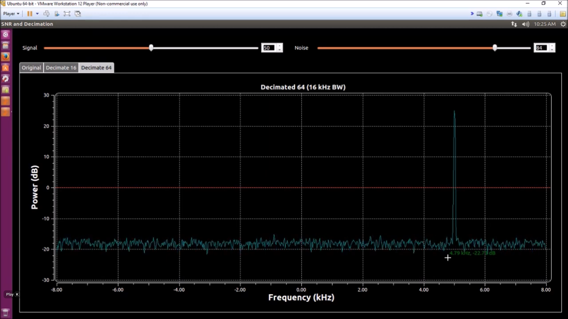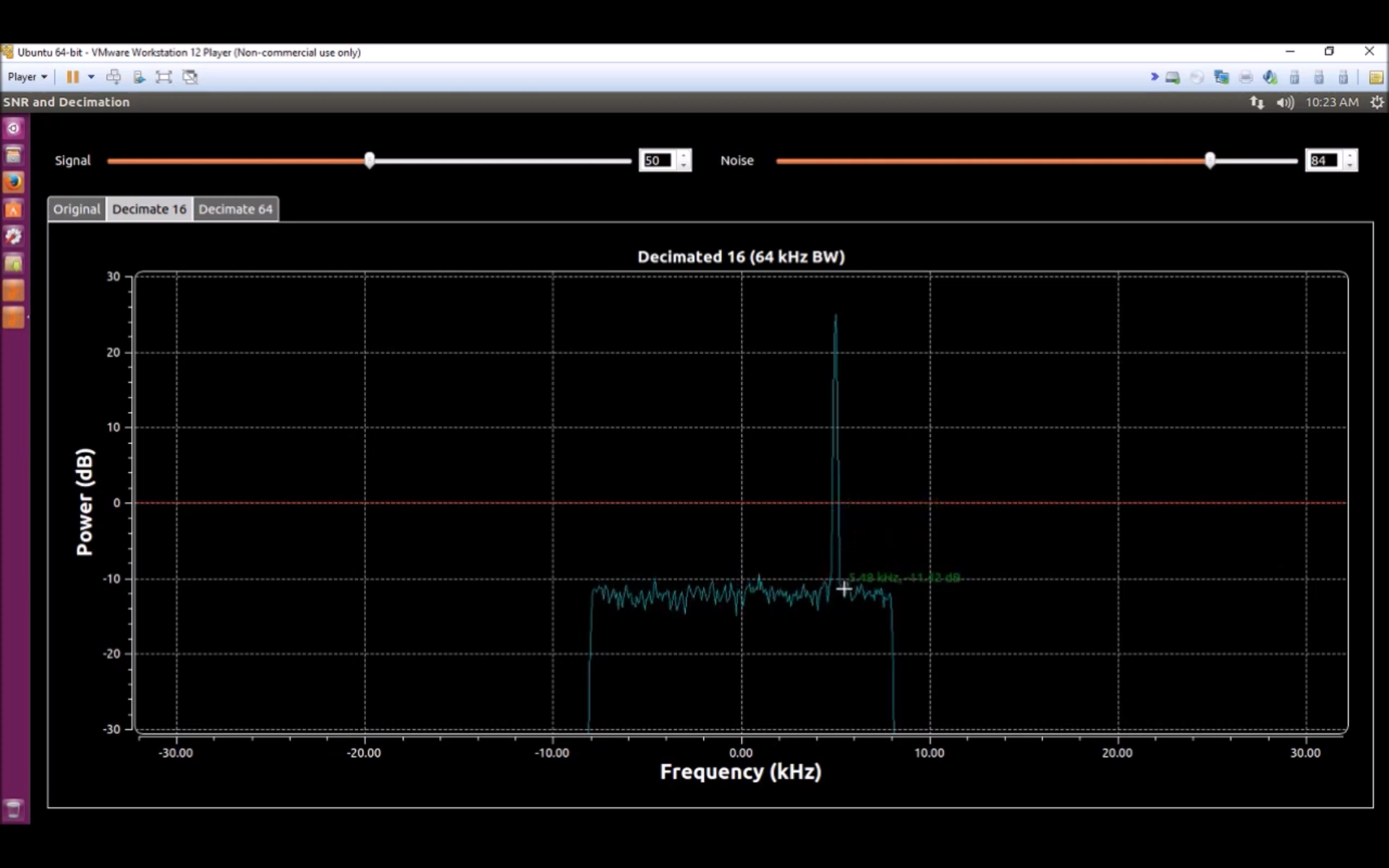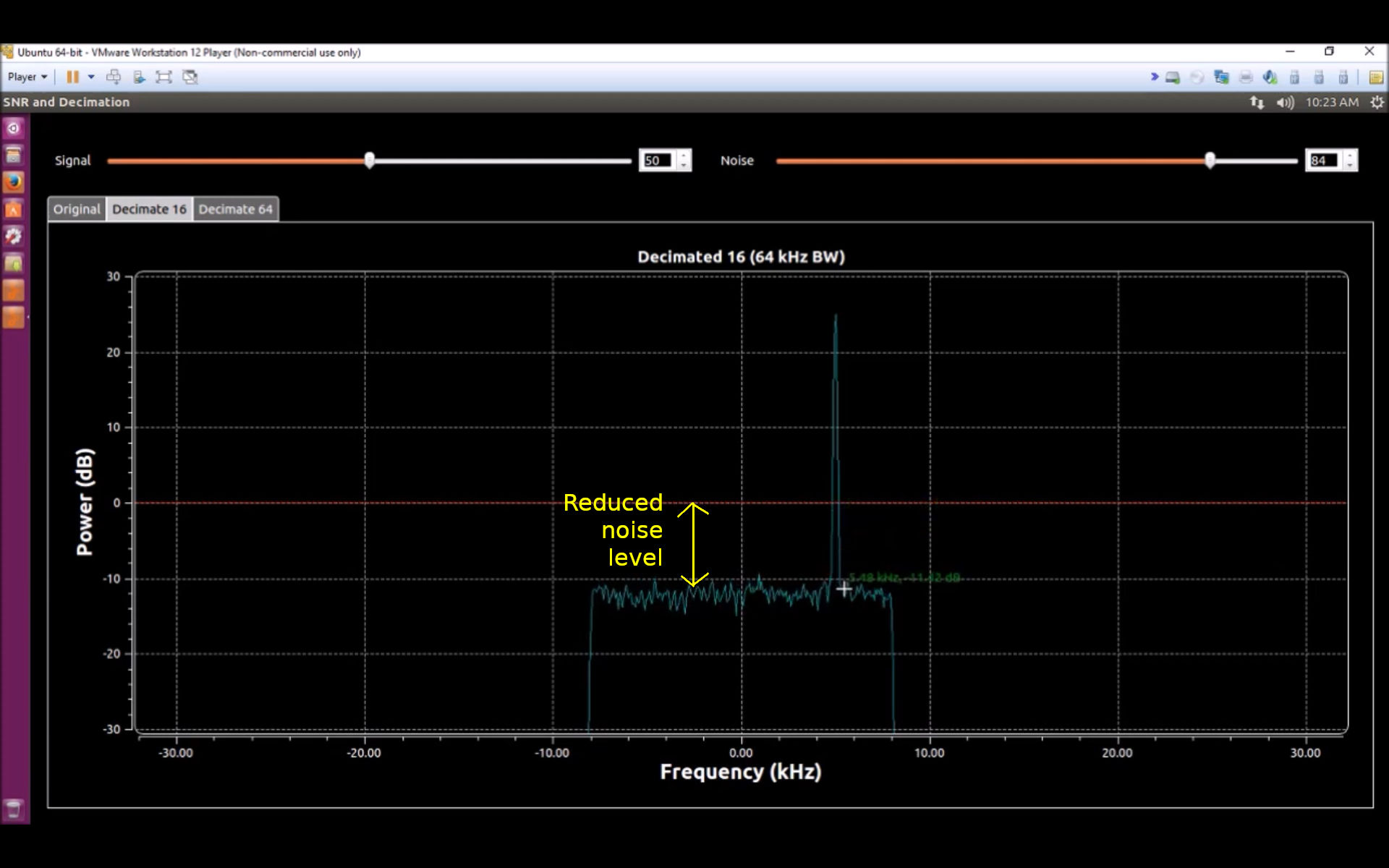 At the same time he's pointing out the reduced noise floor, he also says that the SNR has improved by a factor of 16 (12 dB) due to the 16x reduction of sample rate. Wrong. He's actually improved the SNR by a factor of 64 (18 dB) because that is how much noise he filtered out to begin with. His filter is setup to filter out everything above 8 kHz. That leaves a total bandwidth of 16 kHz (+/-8 kHz). His initial bandwidth was 1.024 MHz. This is a reduction of (1.024e6)/(16e3) = 64. That equates to an improvement of 18 dB, not 12 dB as he claims.